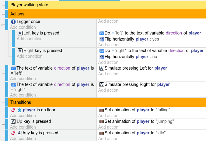 Instead of the animation, we could have created here a dedicated Scene Variable "state" to control the player state. This is more advanced but allows for better flexibility. However, the approach presented here has the benefit of bundling the logic with the corresponding animation, allowing for clarity and simplicity in the event sheet. Furthermore, you have access to the frames of the current animation/state and can trigger some logic at a certain frame inside the animation.